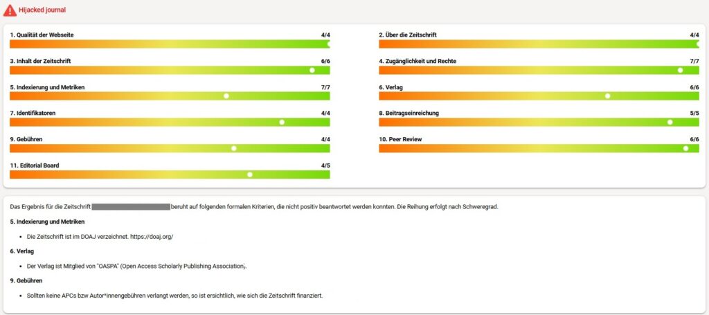 - Grafische Darstellung der Ergebnisse – je mehr rote Bereiche, desto kritischer ist die Zeitschrift einzustufen.